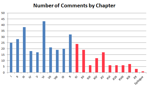 The red bars are chapters I haven’t addressed yet. As you can see, even though I’m chapter-wise around the halfway point, I’m actually about 70% done in terms of number of comments. This is for two reasons: 1) The chapters towards the end of the book tend to be a bit shorter, because some of them are focused on wrapping up the story and that type of narrative doesn’t tend to drag on too long. 2) I wrote the book in linear order, and I got better at writing as I went, so the chapters towards the end didn’t need as much fixing.