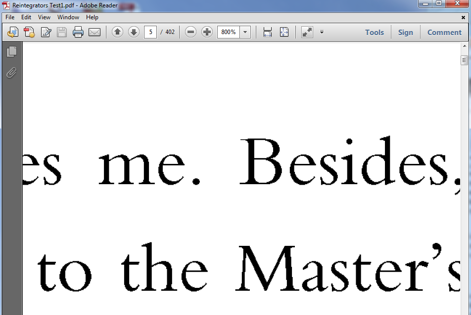Now, I have no idea how this “issue” would affect the actual printed book, but my gut tells me it probably wouldn’t do any good. However, thanks to a helpful forum post, I found a solution: PDF995. This shareware creates a printer on your system which saves files as PDFs, and (unlike Word) it supports embedding OpenType fonts. So, after jumping through a bit of a hoop to get the paper size correct, I printed my document to the PDF995 printer, and just like that, no jaggies: