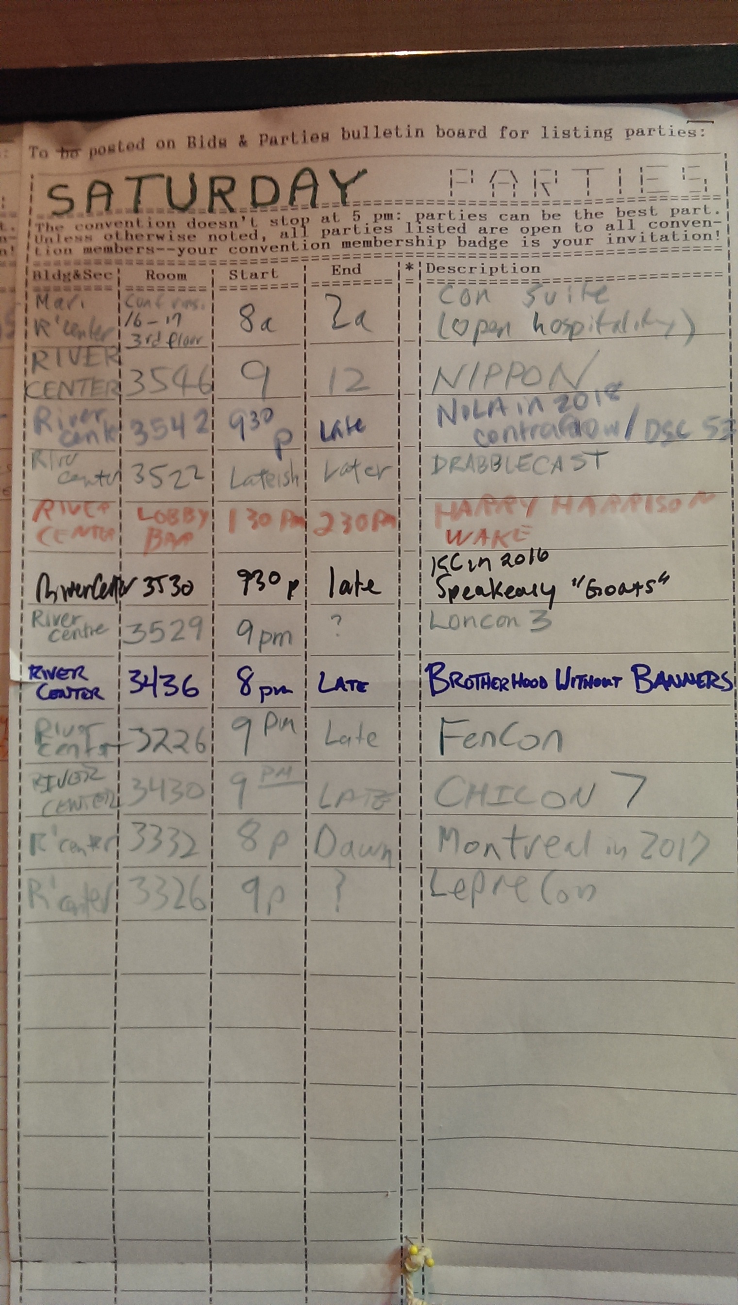 I went to Worldcon this year for the first time. It was an experience. Hard to put into better words than that, especially since my brain is still reeling from so much input. Worldcon serves many purposes, most of which overlap to some degree: there are fannish (autographing, interviews, etc.), social (drinking and schmoozing), craft (panels, workshops, etc.), and industry (drinking and schmoozing again) related activities. There is no such thing as a “perfect” Worldcon schedule, and even after running around like crazy for four days there are plenty of things I wish I had done and people I wish I had met. I am also not the best in the world at partying, given my low alcohol tolerance (as in small amounts of alcohol give me a big hangover) and my self-consciousness at being un/self-published. But, I did meet some really cool folks, gained a few good insights about writing (especially the business side), and there were no major disasters either with travel or back at home while I was gone, so I’m going to count this one as a success.