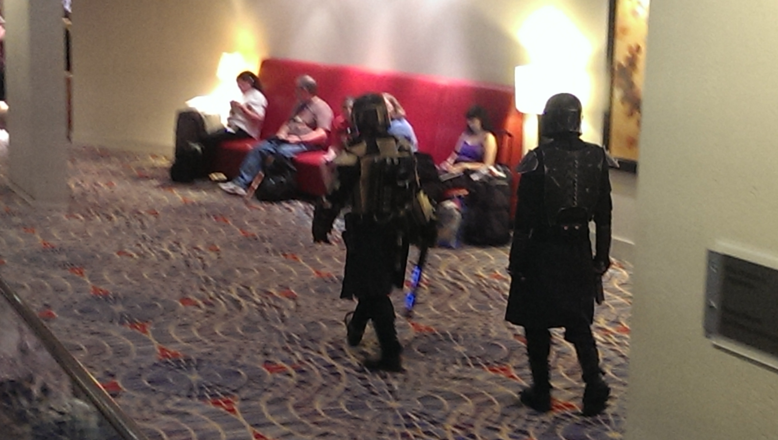 Rather, it’s the little differences which took me by surprise. For example, on a Worldcon badge, your name is in big bold type so that anyone can read it at a glance, whereas at Dragon Con, its printed so small that it might as well not be there at all. A minor thing, yes, but the resulting anonymity has repercussions in how people treat each other. At Worldcon, your social standing among strangers is determined by whether or not people recognize your name. At Dragon Con, it’s determined by who is wearing a costume and who isn’t. Now, this makes me a nobody in either case, which is fine, but it also means that when I interact with someone new at D.C., there’s really nothing for either party to take away unless we get down to the point of formally introducing one another, which can get a bit difficult in a fully packed and moving lobby/bar/hall/line/whatever. This definitely makes introductions a lot less casual and more limited to a few in-depth encounters, but even these are stifled by what I perceive as a certain cliquishness among the attendees. Worldcon had room parties, which while problematic in their own right, were also full of people just hanging out, looking to meet someone new. Maybe its just my inexperience with the scene and inability to navigate unfamiliar waters, but even at the “socially”-geared events at Dragon Con, just about everyone was only interested in chatting with their small groups of friends and getting drunk.