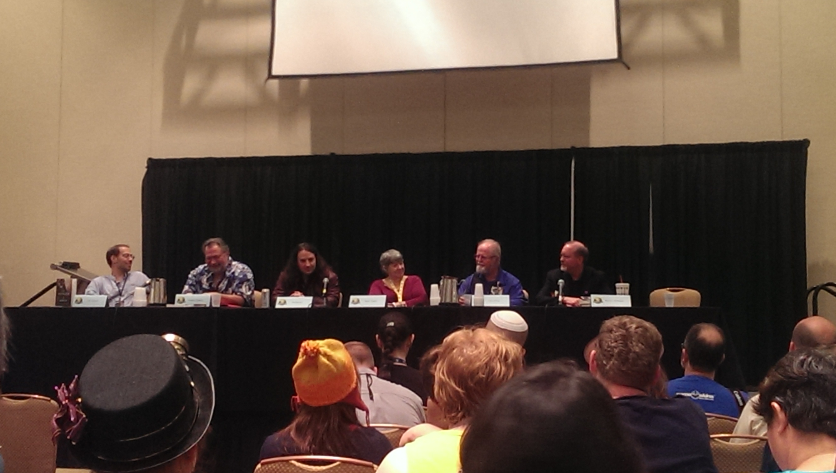 And all of this plays into the networking problem described above, as well. The Writer’s Track proved a much-needed oasis from the madness of Dragon Con, but it failed to provide the Worldcon-like experience of being able to turn to the person next to you with the subtle understanding that they too take this writing stuff seriously and the two of you are therefore in some way simpatico. Were there plenty of such people around me at any given moment? Undoubtedly, but how could I possibly know which ones they were? It’s a puzzle that I’ll need to mull over and solve before I plan to go back.